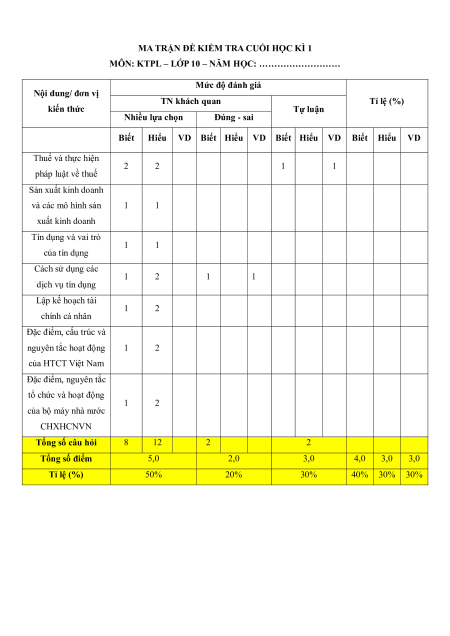 tổ chức và hoạt động 1 2 của bộ máy nhà nước CHXHCNVN Tổng số câu hỏi 8 12 2 2 Tổng số điểm 5,0 2,0 3,0 4,0 3,0 3,0 Tỉ lệ (%) 50% 20% 30% 40% 30% 30%