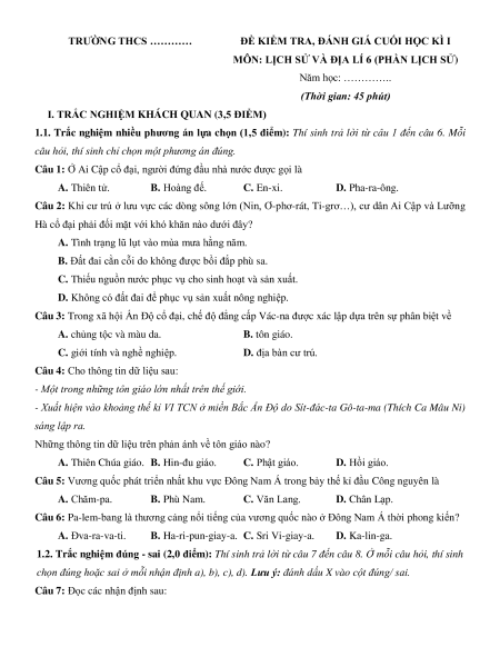 MÔN: LỊCH SỬ VÀ ĐỊA LÍ 6 (PHẦN LỊCH SỬ) Năm học: …………..