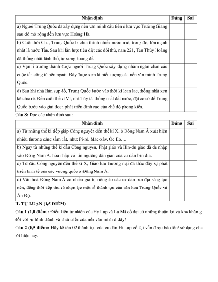 Câu 1 (1,0 điểm): Điều kiện tự nhiên của Hy Lạp và La Mã cổ đại có những thuận lợi và khó khăn gì