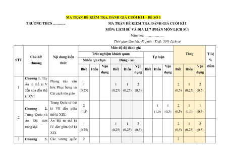 Trắc nghiệm khách quan Tổng Tỉ lệ Chủ đề/ Nội dung kiến Tự luận STT Nhiều lựa chọn Đúng - sai % chương thức Vận Vận Vận Vận điểm Biết Hiểu Biết Hiểu Biết Hiểu Biết Hiểu dụng dụng dụng dụng Chương 1. Phong trào văn Tây Âu từ thế 1 1 2 1 2 2 1 1 hóa Phục hưng và kỉ V đến nửa (0,25) (0,25) (0,5) (0,25) (0,5) (0,5) (0,25) Cải cách tôn giáo đầu thế kỉ XVI Trung Quốc từ 2 1 1 2 1 1 Chương