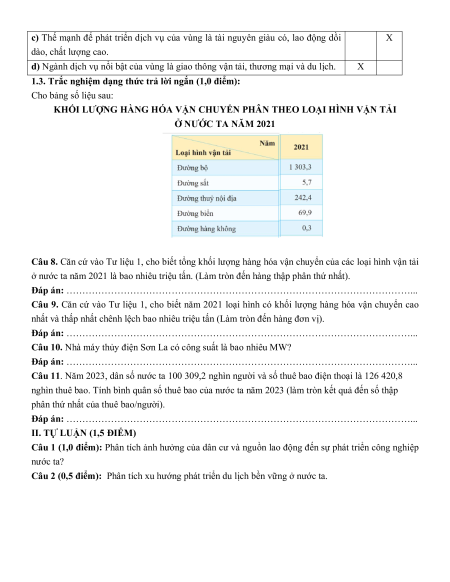Câu 8. Căn cứ vào Tư liệu 1, cho biết tổng khối lượng hàng hóa vận chuyển của các loại hình vận tải