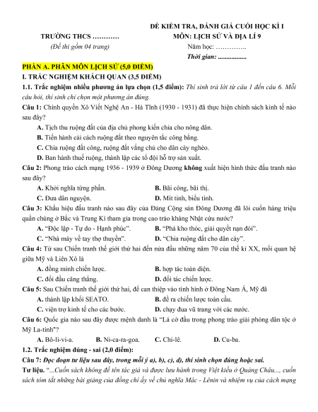 PHẦN A. PHÂN MÔN LỊCH SỬ (5,0 ĐIỂM)