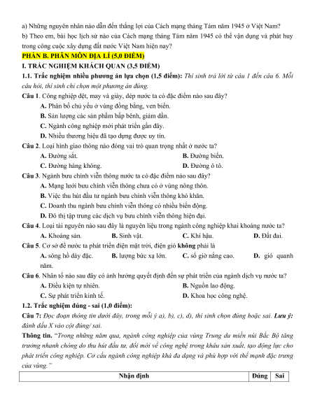 PHẦN B. PHÂN MÔN ĐỊA LÍ (5,0 ĐIỂM)