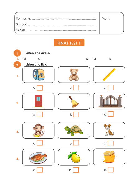 Class: ……………………………………………………………… FINAL TEST 1 Listen and circle. 1 1. b d 2. d b 2 Listen and tick. 2 1. a b c 2. a b c 3. a b c 4. a b c