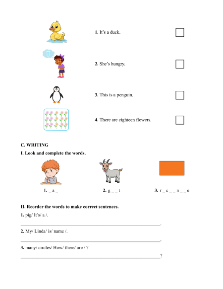 II. Reorder the words to make correct sentences. 1. It’s a pig. 2. My name is Linda.