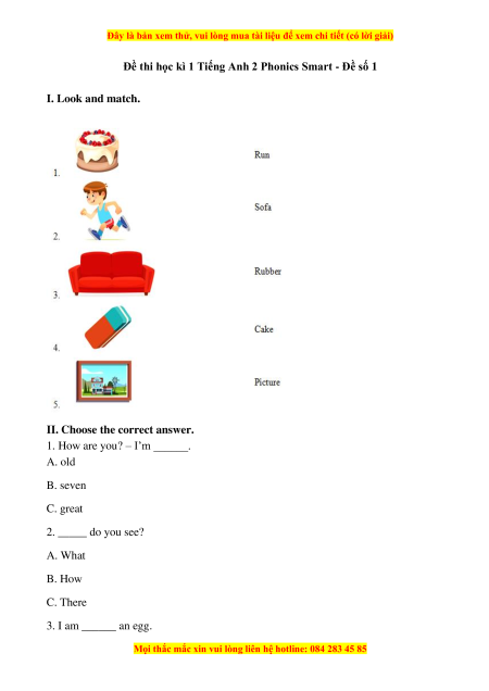 Đề thi học kì 1 Tiếng Anh 2 Phonics Smart - Đề số 1 I. Look and match.