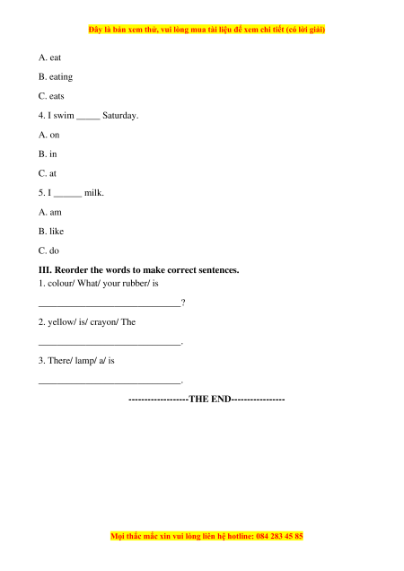 A. eat B. eating C. eats 4. I swim _____ Saturday. A. on B. in C. at 5. I ______ milk. A. am B. like C. do