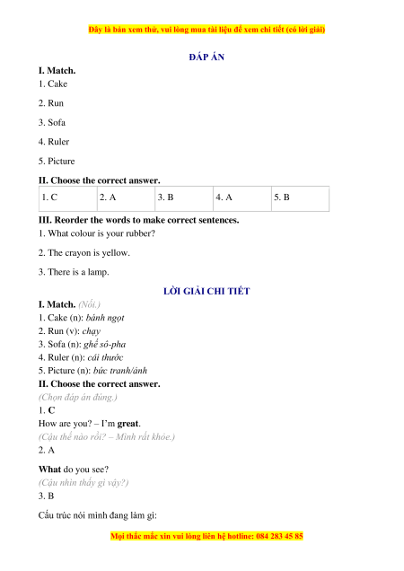 ĐÁP ÁN I. Match. 1. Cake 2. Run 3. Sofa 4. Ruler 5. Picture