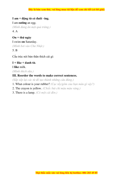 (Mình đang ăn một quả trứng.) 4. A On + thứ ngày I swim on Saturday.