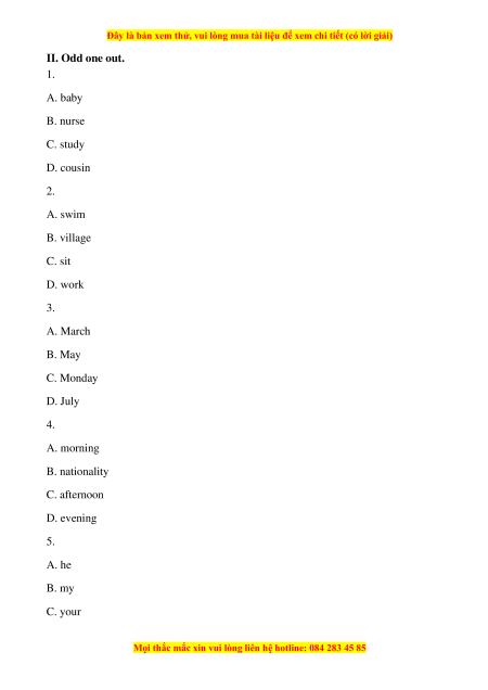 II. Odd one out. 1. A. baby B. nurse C. study D. cousin 2. A. swim B. village C. sit D. work 3. A. March B. May C. Monday D. July 4. A. morning B. nationality C. afternoon D. evening 5. A. he B. my C. your