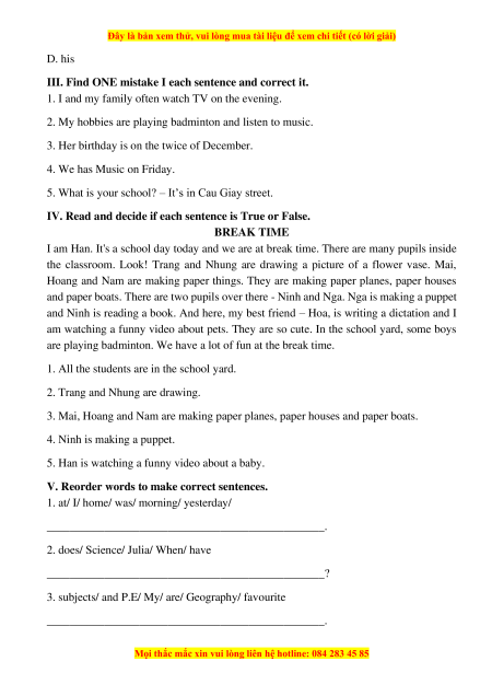 IV. Read and decide if each sentence is True or False. 1. F 2. T 3. T 4. F 5. F