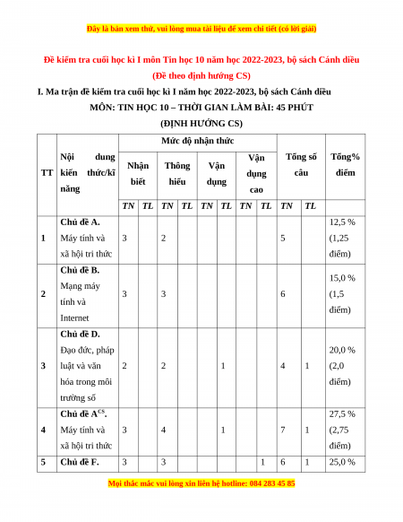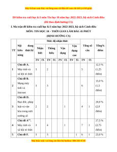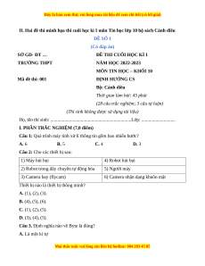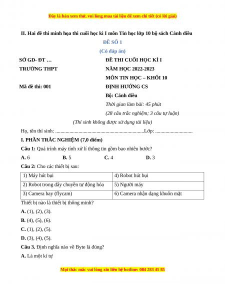 II. Hai đề thi minh họa thi cuối học kì I môn Tin học lớp 10 bộ sách Cánh diều ĐỀ SỐ 1 (Có đáp án) SỞ GD- ĐT …