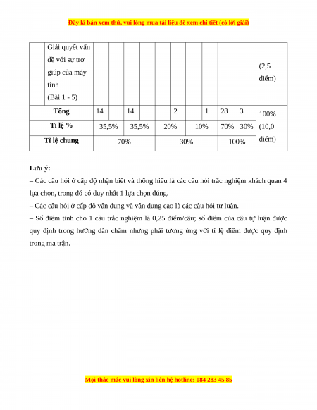 Giải quyết vấn đề với sự trợ (2,5 giúp của máy điểm) tính (Bài 1 - 5) Tổng 14 14 2 1 28 3 100% Tỉ lệ % 35,5% 35,5% 20% 10% 70% 30% (10,0 Tỉ lệ chung điểm) 70% 30% 100% Lưu ý: