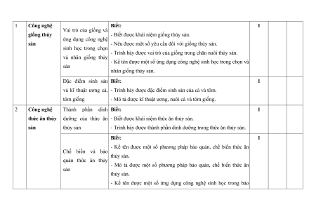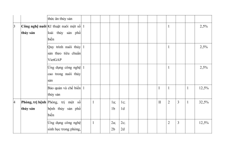 Công nghệ nuôi Kĩ thuật nuôi một số 1 1 2,5% thủy sản loài thủy sản phổ biến Quy trình nuôi thủy 1 1 2,5% sản theo tiêu chuẩn VietGAP Ứng dụng công nghệ 1 1 2,5% cao trong nuôi thủy sản