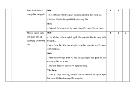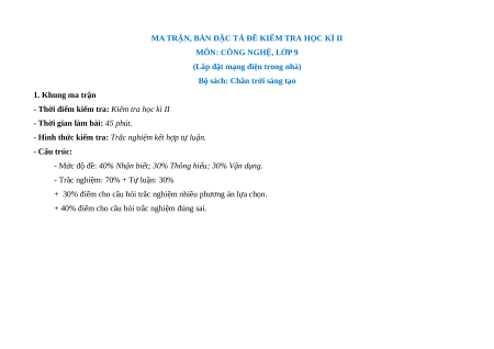 điện trong mạng điện trong nhà 1b 1d nhà Thực hành lắp đặt 2 2 2a; 2c; 4 4 20% mạng điện trong nhà 2b 2d Một số ngành nghề 4 3a; 3c; I; 8 4 2 60% liên quan đến lắp 4b 3d II đặt mạng điện trong 4a; 4c; nhà 4b 4d Tổng số câu 8 4 4 2 16 12 2 Tổng số điểm 3 4 3 100% Tỉ lệ % 30% 40% 30 % 100% 2. Bản đặc tả