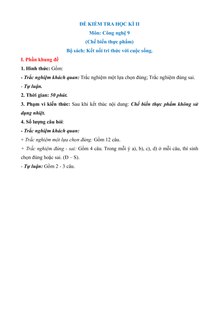 Bộ đề thi Cuối kì 2 Công nghệ 9 Kết nối tri thức Chế biến thực phẩm