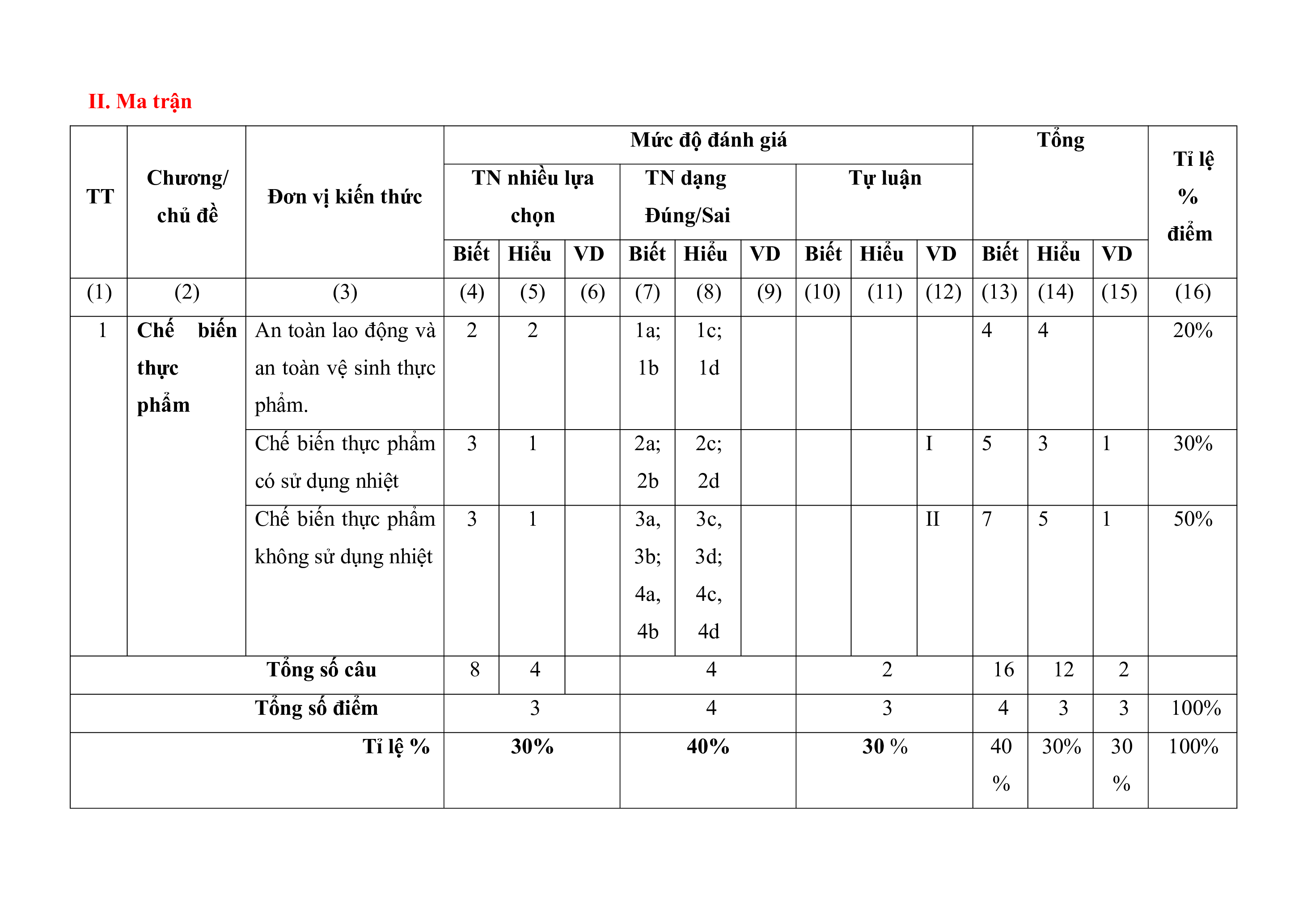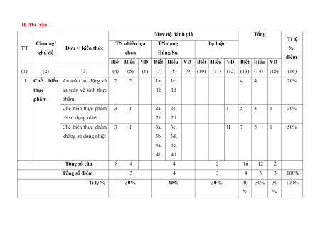 1 Chế biến An toàn lao động và 2 2 1a; 1c; 4 4 20% thực an toàn vệ sinh thực 1b 1d phẩm phẩm. Chế biến thực phẩm 3 1 2a; 2c; I 5 3 1 30% có sử dụng nhiệt 2b 2d Chế biến thực phẩm 3 1 3a, 3c, II 7 5 1 50% không sử dụng nhiệt 3b; 3d; 4a, 4c, 4b 4d Tổng số câu 8 4 4 2 16 12 2 Tổng số điểm 3 4 3 4 3 3 100% Tỉ lệ % 30% 40% 30 % 40 30% 30 100% % % III. Đề kiểm tra Sở GD- ĐT …