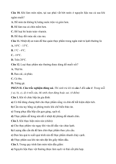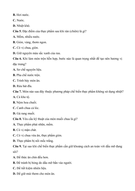 Câu 7. Món nào sau đây thuộc phương pháp chế biến thực phẩm không sử dụng nhiệt? A. Cá kho tộ. B. Nộm hoa chuối. C. Canh chua cá lóc. D. Gà rang muối.