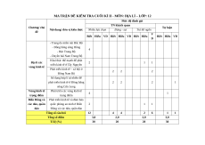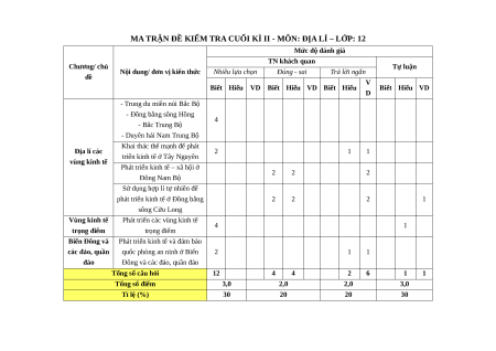 MA TRẬN ĐỀ KIỂM TRA CUỐI KÌ II - MÔN: ĐỊA LÍ – LỚP: 12 Mức độ đánh giá TN khách quan Chương/ chủ Tự luận