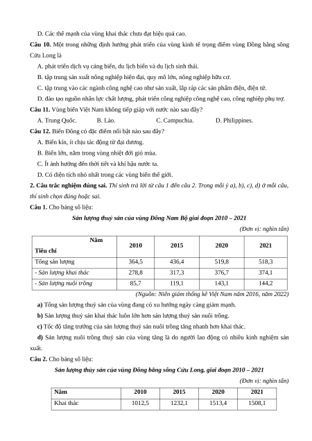 Câu 2. Năm 2021, sản lượng thủy sản khai thác của Đông Nam Bộ là 374,1 nghìn tấn, sản lượng nuôi