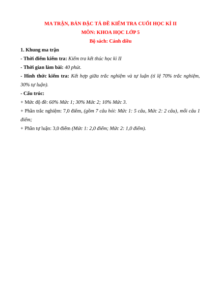 - Tailieugiaovien.com.vn giới thiệu bộ 2 đề Cuối kì 2 gồm đầy đủ ma trận và lời giải chi tiết môn Khoa học lớp 5 Cánh diều mới nhất năm 2025 nhằm giúp Giáo viên có thêm tài liệu tham khảo ra đề thi Khoa học lớp 5.