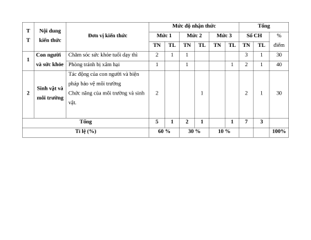 Đơn vị kiến thức Mức 1 Mức 2 Mức 3 Số CH % T kiến thức TN TL TN TL TN TL TN TL điểm Con người
