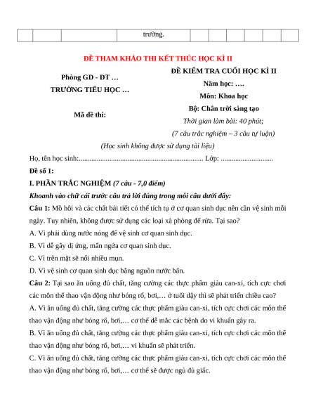 - Tailieugiaovien.com.vn giới thiệu bộ 2 đề Cuối kì 2 gồm đầy đủ ma trận và lời giải chi tiết môn Khoa học lớp 5 Chân trời sáng tạo mới nhất năm 2025 nhằm giúp Giáo viên có thêm tài liệu tham khảo ra đề thi Khoa học lớp 5.