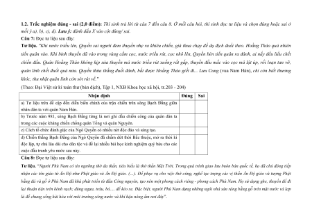 nhiều bài học kinh nghiệm quý báu cho các cuộc đấu tranh yêu nước sau này. Câu 8: Nhận định Đúng Sai
