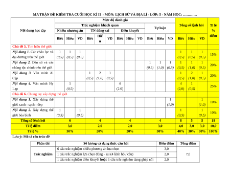 MA TRẬN ĐỀ KIỂM TRA CUỐI HỌC KÌ II - MÔN: LỊCH SỬ VÀ ĐỊA LÍ - LỚP: 5 - NĂM HỌC: ………… Mức độ đánh giá