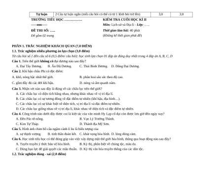 Bộ đề thi Cuối kì 2 Lịch sử&Địa Lí lớp 5 Kết nối tri thức có đáp án