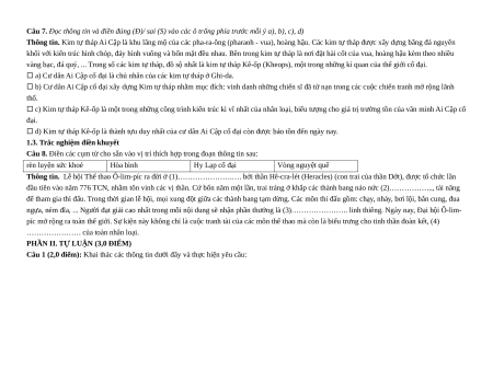 Câu 4. Công trình nào dưới đây được coi là kiệt tác của văn minh Hy Lạp cổ đại còn được lưu giữ đến ngày nay? A. Đền Pác-tê-nông. B. Vạn Lý Trường Thành. C. Kim Tự Tháp. D. Thánh địa Mỹ Sơn.