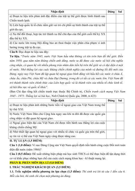 1.2. Trắc nghiệm đúng - sai (2,0 điểm): Thí sinh trả lời từ câu 7 đến câu 8. Ở mỗi câu hỏi, thí