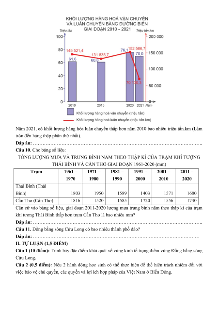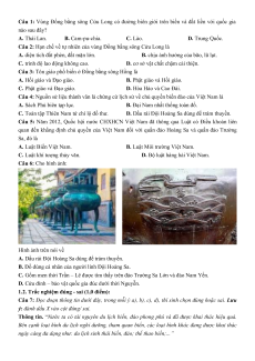 Câu 1: Vùng Đồng băng sông Cưu Long có đường biên giới trên biển và đất liền với quốc gia nào sau đây? A. Thái Lan. B. Cam-pu-chia. C. Lào. D. Trung Quốc.