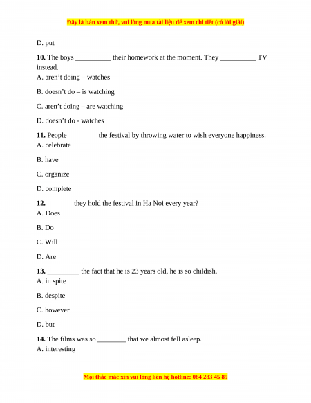 12. _______ they hold the festival in Ha Noi every year? A. Does B. Do C. Will D. Are