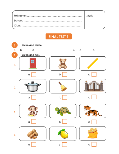 Class: ……………………………………………………………… FINAL TEST 1 1 Listen and circle. 1. b d 2. a b 2 Listen and tick. 1. a b c 2. a b c 3. a b c 4. a b c