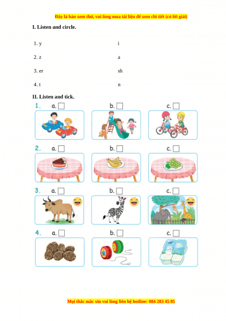 I. Listen and circle. 1. y i 2. z a 3. er sh 4. t n II. Listen and tick.