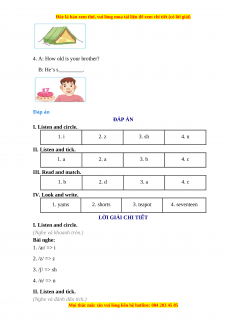 4. A: How old is your brother? B: He’s s_________. Đáp án ĐÁP ÁN I. Listen and circle. 1. i 2. z 3. sh 4. n II. Listen and tick. 1. a 2. a 3. b 4. c III. Read and match. 1. b 2. d 3. a 4. c IV. Look and write. 1. yams 2. shorts 3. teapot 4. seventeen LỜI GIẢI CHI TIẾT I. Listen and circle.