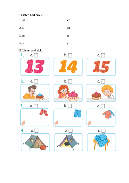 (Nghe và khoanh tròn.) Bài nghe: 1. /ə(r)/ => er 2. /ʃ/ => sh 3. /n/ => n 4. /t/ => t II. Listen and tick.