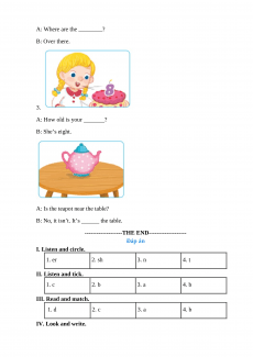 I. Listen and circle. 1. sh er 2. s sh 3. m n 4. v t II. Listen and tick. III. Read and match. IV. Look and write. A: What number is it? B: It’s ________. 2. A: Where are the ________? B: Over there. 3. A: How old is your _______? B: She’s eight.