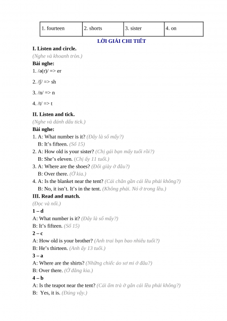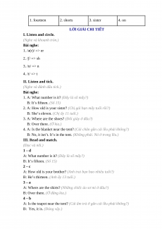-------------------THE END------------------- Đáp án I. Listen and circle. 1. er 2. sh 3. n 4. t II. Listen and tick. 1. c 2. b 3. a 4. b III. Read and match. 1. d 2. c 3. a 4. b IV. Look and write. 1. fourteen 2. shorts 3. sister 4. on LỜI GIẢI CHI TIẾT I. Listen and circle.