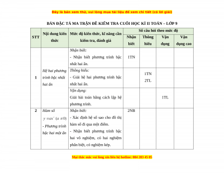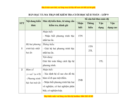 BẢN ĐẶC TẢ MA TRẬN ĐỀ KIỂM TRA CUỐI HỌC KÌ II TOÁN – LỚP 9