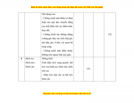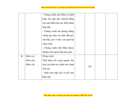 Hình trụ - Hình nón – 4 1 5% Hình cầu Tổng: Số câu 6 2 8 1 1 18 Điểm (1,5đ) (0,5đ) (5,5đ) (1,5đ) (1,0đ) (10đ) Tỉ lệ 15% 60% 15% 10% 100%
