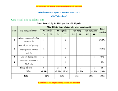 Đề kiểm tra cuối học kì II năm học 2022 – 2023 Môn Toán – Lớp 9