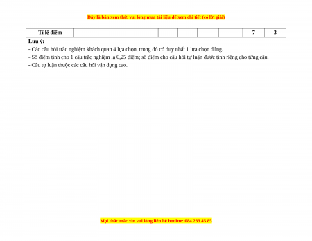 - Số điểm tính cho 1 câu trắc nghiệm là 0,25 điểm; số điểm cho câu hỏi tự luận được tính riêng cho từng câu.