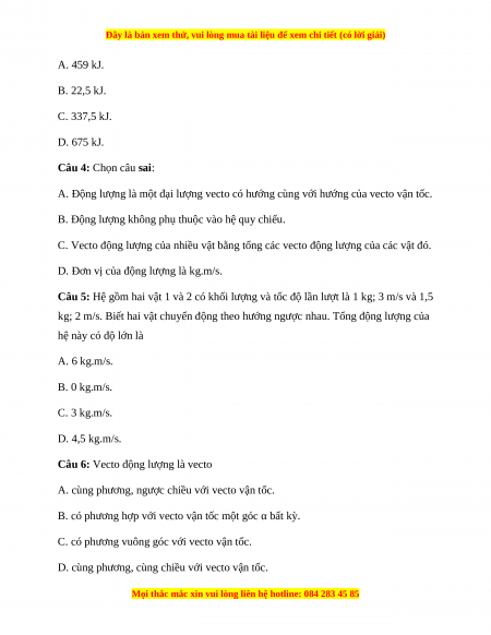 Câu 5: Hệ gồm hai vật 1 và 2 có khối lượng và tốc độ lần lượt là 1 kg; 3 m/s và 1,5