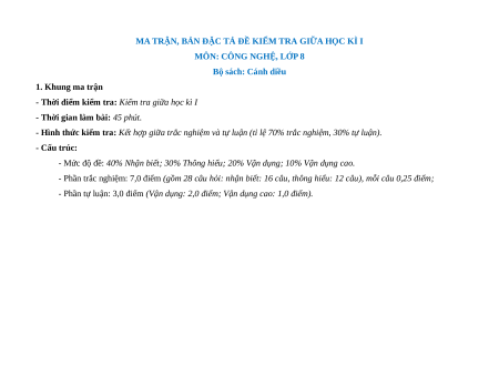 - Tailieugiaovien.com.vn giới thiệu bộ 10 đề giữa kì 1 gồm đầy đủ ma trận và lời giải chi tiết môn Công nghệ 8 bộ Cánh Diều mới nhất năm 2024 nhằm giúp Giáo viên có thêm tài liệu tham khảo ra đề thi Công nghệ lớp 8.