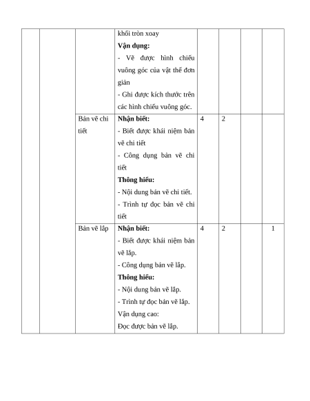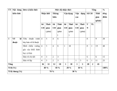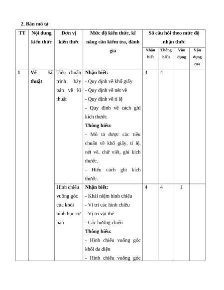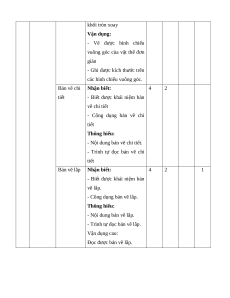 Vẽ kĩ Tiêu chuẩn trình 4 3 4 6 8 9 20 thuật bày bản vẽ kĩ thuật Hình chiếu vuông 4 3 4 6 1 10 8 1 19 40 góc của khối hình học cơ bản Bản vẽ chi tiết 4 3 2 3 6 6 15 Bản vẽ lắp 4 3 2 3 1 5 6 1 11 25 Tổng 16 12 12 18 1 10 1 5 28 2 45 Tỉ lệ (%) 40 % 30 % 20 % 10 % 100% Tỉ lệ chung (%) 70 % 30 % 2. Bản mô tả TT Nội dung Đơn vị