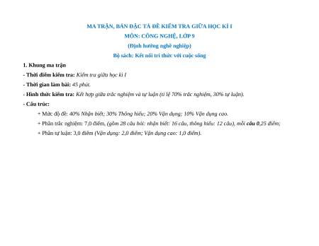 - Tailieugiaovien.com.vn giới thiệu bộ 2 đề giữa kì 1 gồm đầy đủ ma trận và lời giải chi tiết môn Công nghệ 9 Kết nối tri thức Định hướng nghề nghiệp mới nhất năm 2024 nhằm giúp Giáo viên có thêm tài liệu tham khảo ra đề thi Công nghệ 9.