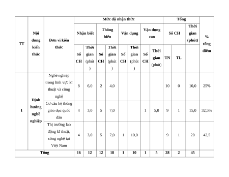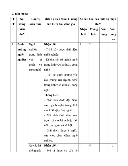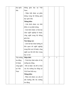trong lĩnh vực kĩ 8 6,0 2 4,0 10 0 10,0 25% thuật và công nghệ Định Cơ cấu hệ thống hướng 1 giáo dục quốc 4 3,0 5 7,0 1 5,0 9 1 15,0 32,5% nghề dân nghiệp Thị trường lao động kĩ thuật, 4 3,0 5 7,0 1 10,0 9 1 20 42,5 công nghệ tại Việt Nam Tổng 16 12 12 18 1 10 1 5 28 2 45 Tỉ lệ (%) 40 % 30 % 20 % 10 % 100% Tỉ lệ chung (%) 70 % 30 % 2. Bản mô tả T Nội Đơn vị