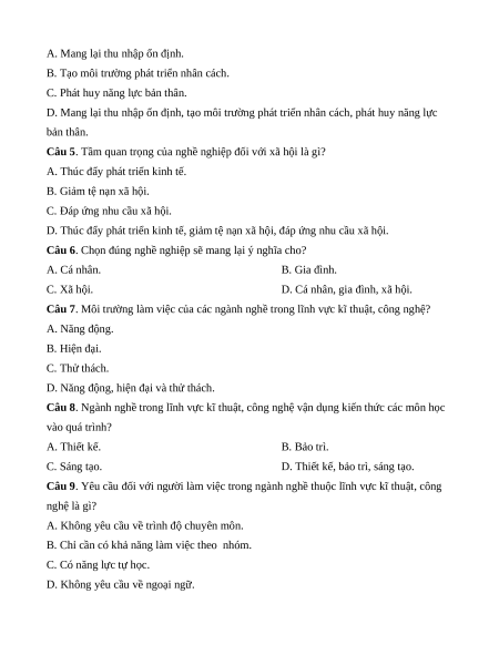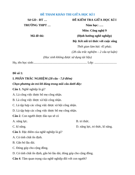 Bộ đề thi giữa kì 1 Công nghệ 9 Kết nối tri thức Định hướng nghề nghiệp